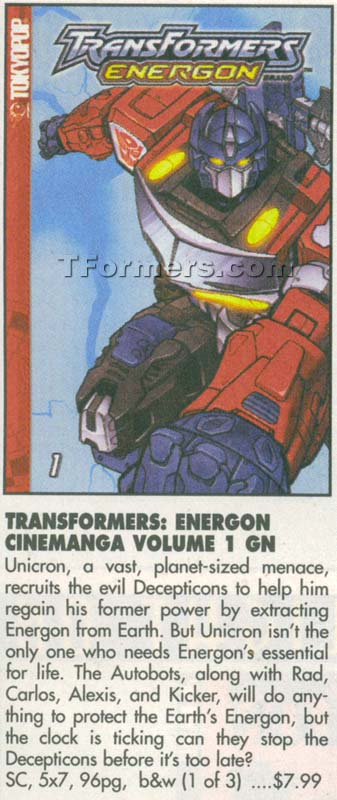From Previews comes news that TOKYOPOP has announced the release of the Transformers Energon Cinemanga Volume 1 graphic novel. The first of the three book series should be released some time this spring for $7.99.