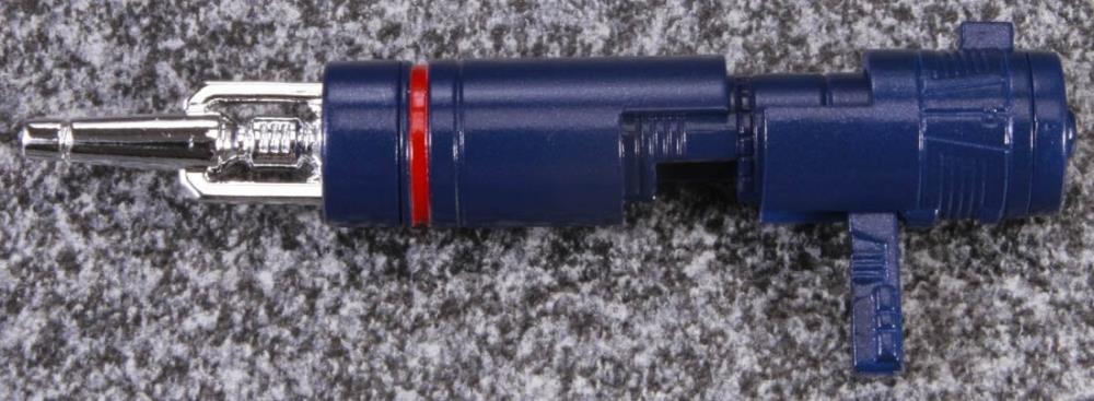 Soundwave includes a concussion blaster and non-firing rocket launcher, and unlike the G1 toy, they can be stored in his back instead of becoming batteries for his tape deck mode. He also comes with a wrist-mounted sensor, has integrated speakers in his forearms, a complete Megatron gun, an empty energon cube that can plug into his chest panel, and a grid-pattern display that fits over the chest door.