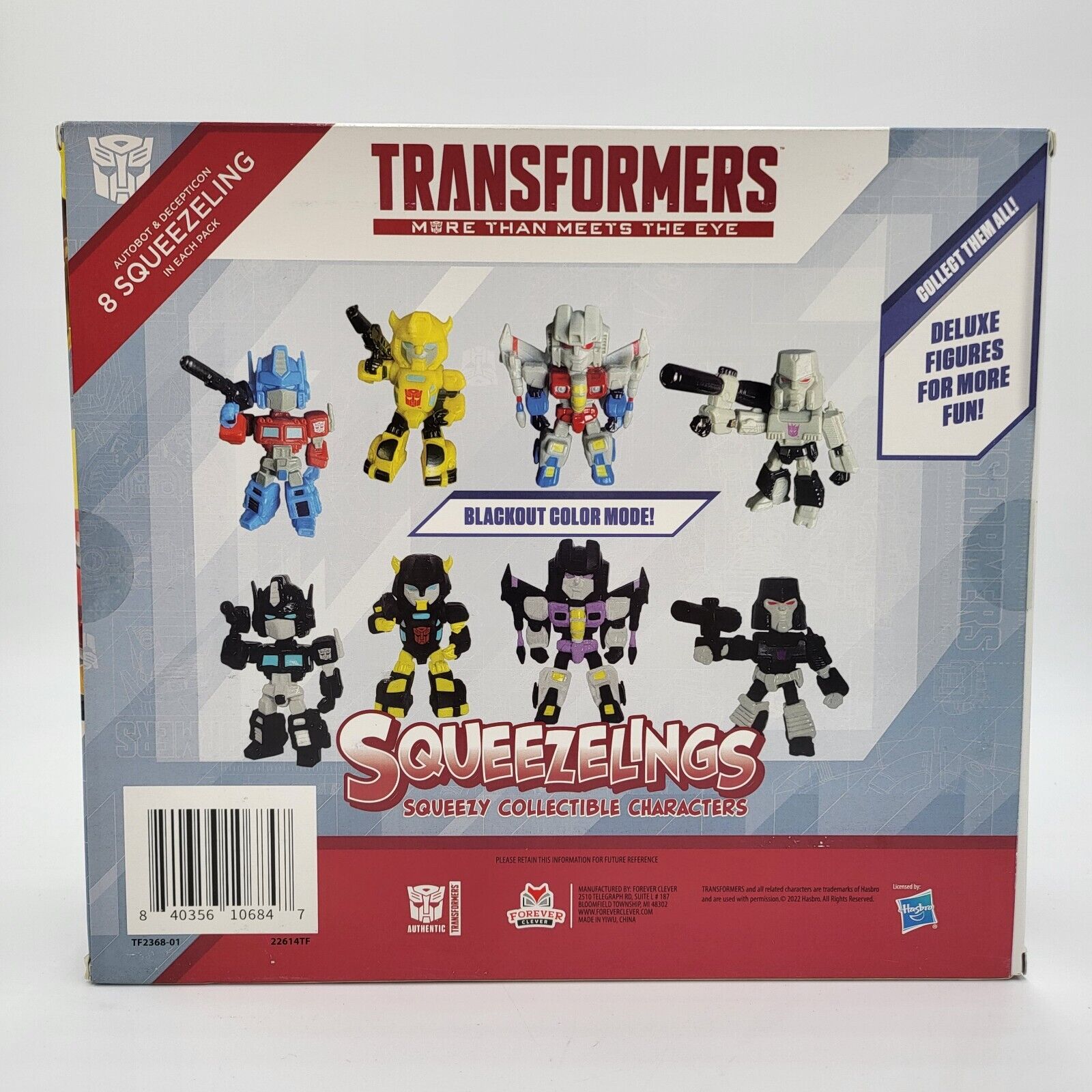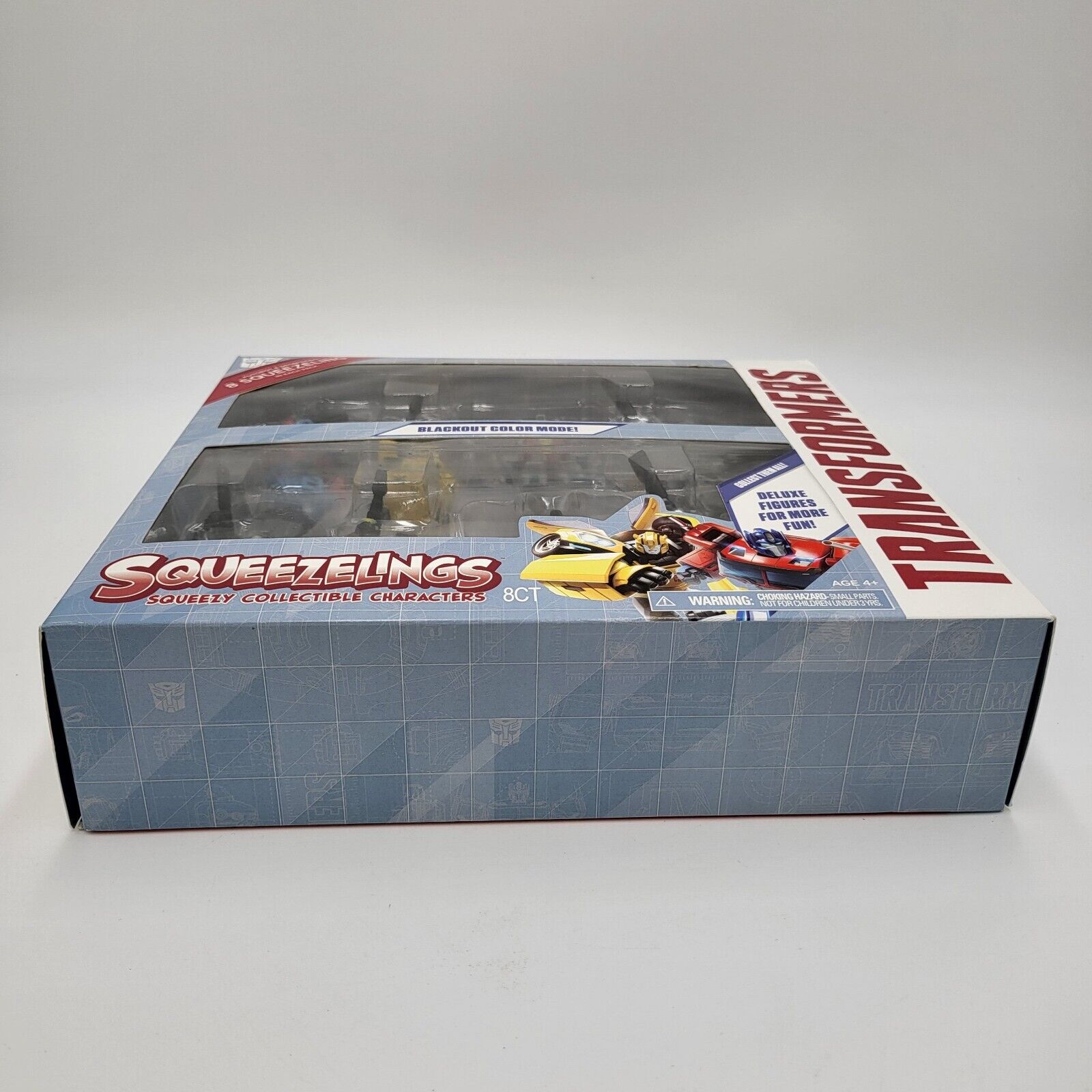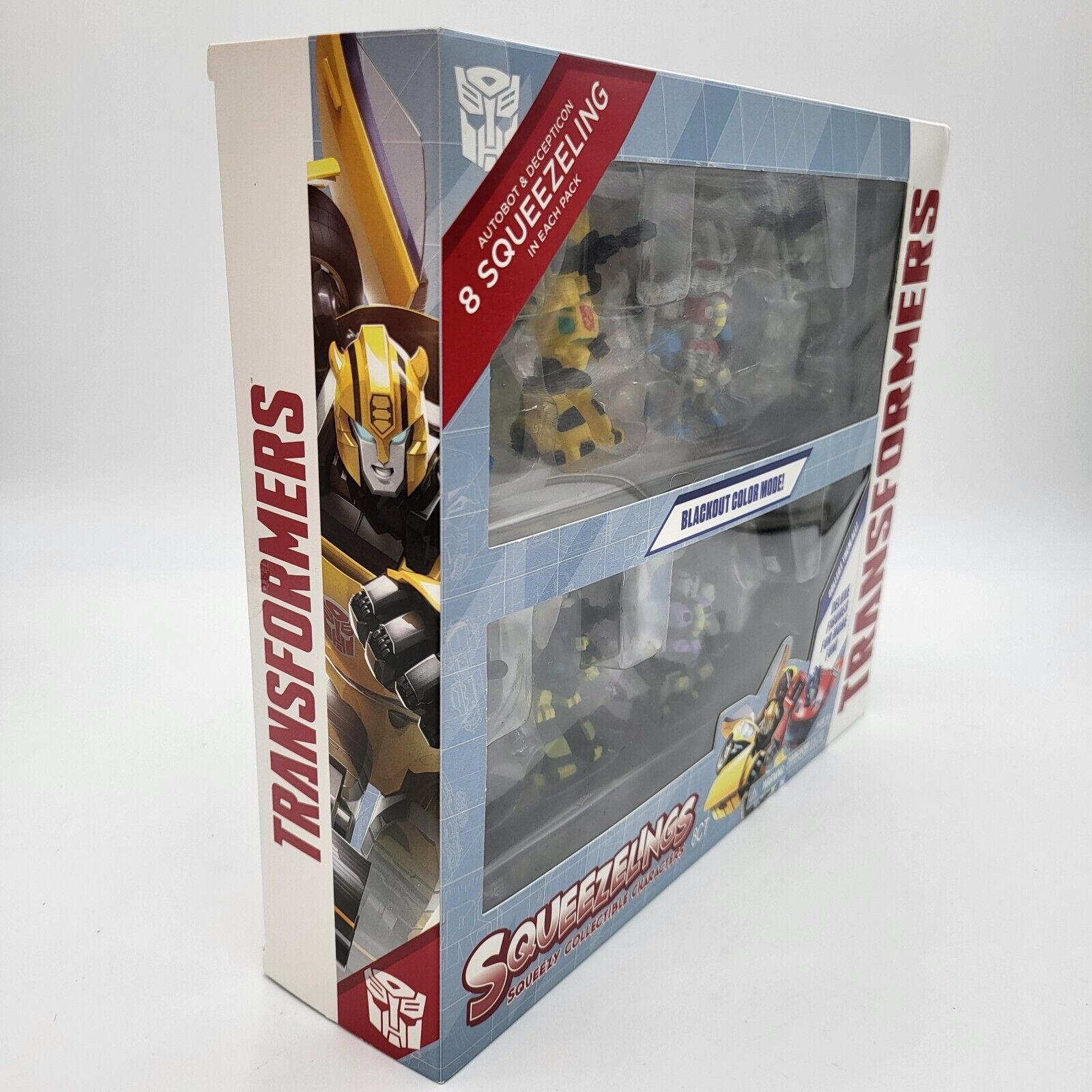 Following the blind packs of the Forever Clever Transformers Squeezelings rubbery figurines sold at Dollar Tree stores, we have news and in-hand images of another gift pack. The Blackout Color Modes 8-Pack pairs the four original G1 colors Optimus Prime, Bumblebee, Starscream and Megatron with their "Blackout" versions. What looks like Nemesis Prime, ROTF Black Bumblebee, Dark Starscream, and Black Megatron could be something else entirely. The @Legendsofvintage seller on Ebay has a bunch of them for about $15 USD, so its not sure if these are new or old stock.