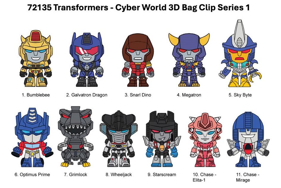This Transformers: Cyberworld Series 1 3D Foam Bag Clip Random 6-Pack includes a total of 6x randomly selected, individually bagged bag clips. Ages 4 and up.