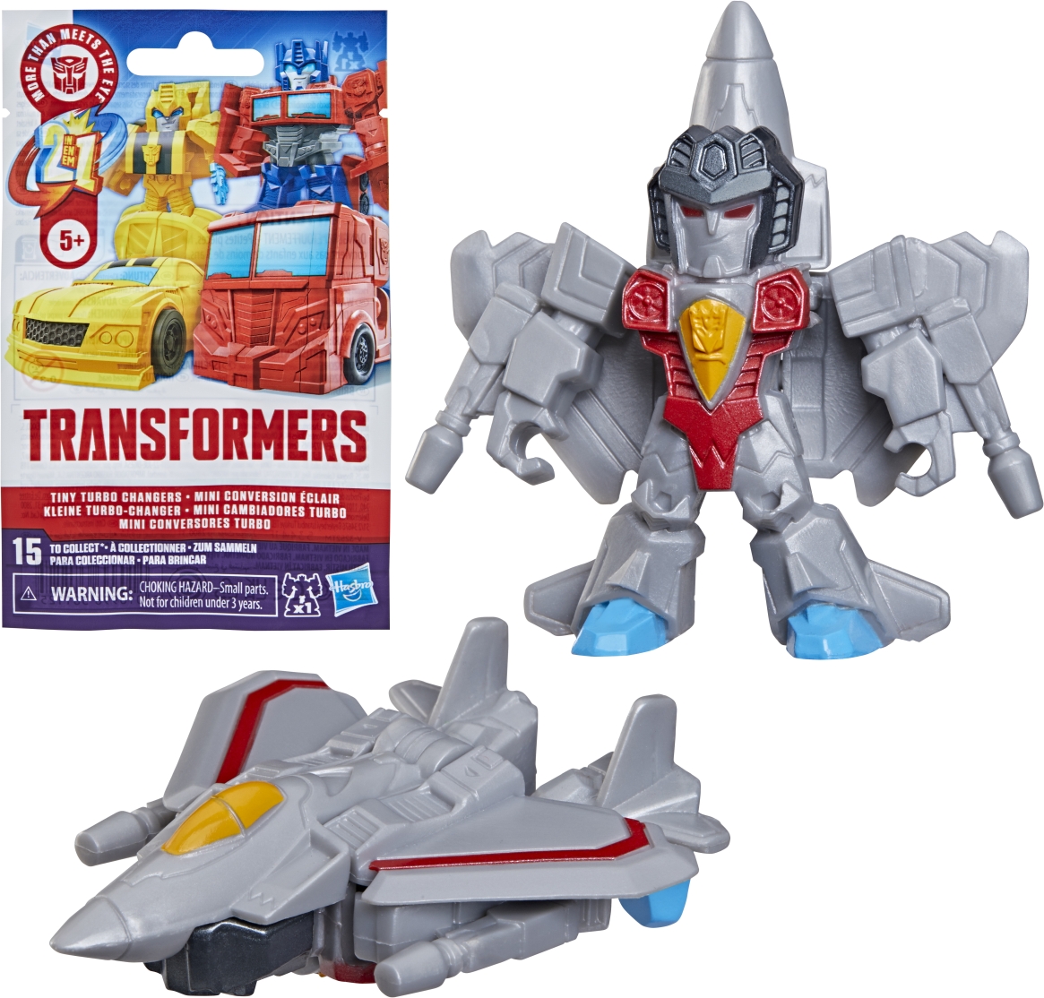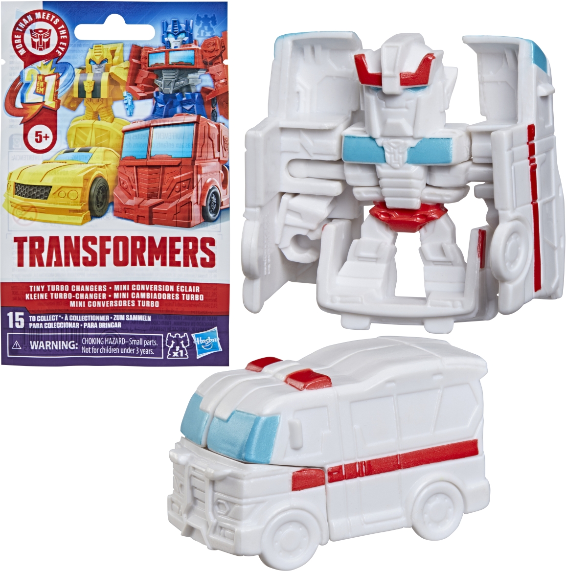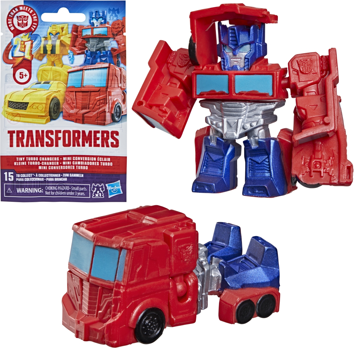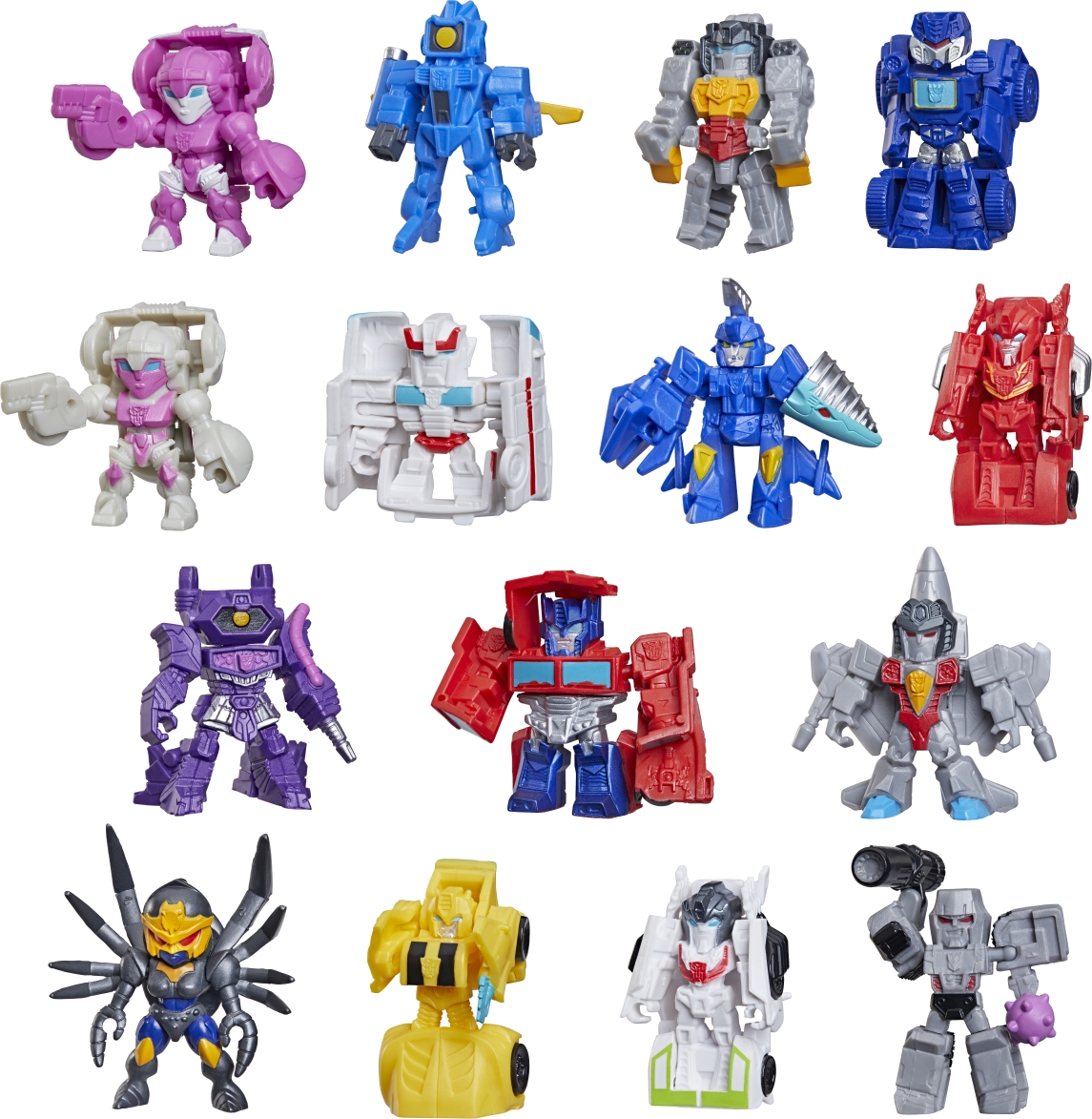 Discover 1 of 15 surprise mini action figures with TRANSFORMERS Tiny Turbo Changers toys! Each 1.5-inch figure changes from robot mode to alt mode in just 2 to 5 steps that are simple enough for kids ages 5 and up. Possible characters are Optimus Prime, Bumblebee, Wheeljack, Autobot Whirl, Arcee, Autobot Hot Rod, Autobot Ratchet, Elita-1, Grimlock, Megatron, Shockwave, Soundwave, Starscream, Blackarachnia, and SkyByte. These small TRANSFORMERS toys make great stocking stuffers, Easter basket fillers, or birthday party favor toys.