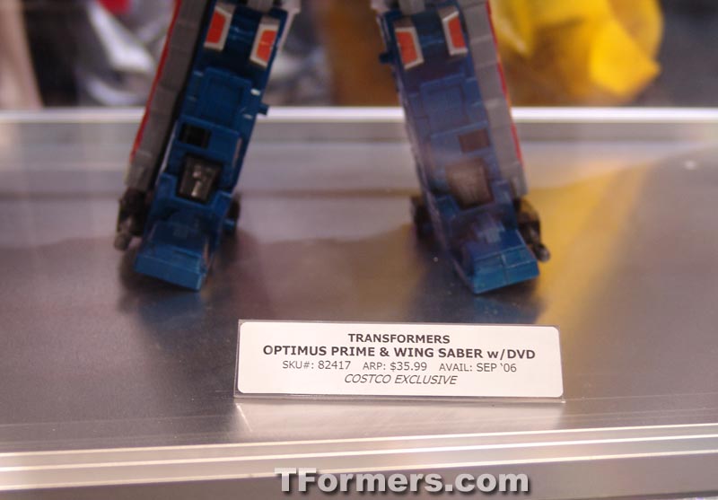 A product discription card was setup on an empty shelf of one of the Hasbro Transformers display cases with the description of Transformers Optimus Prime and Wing Saber Costco Exclusive retailing at $35.99 set for September 2006. Update: we have a new new images of the figures and have confirmed with Hasbro the set will include the regular Prime and Wing Saber figures. We were told they plan to pack the figure in Sonic Wing Mode.