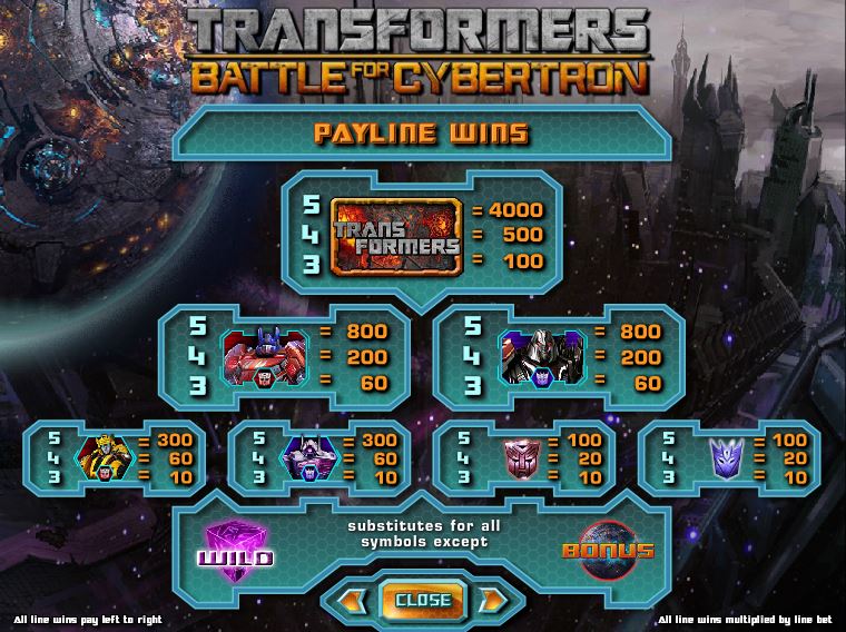 Choose your side as the Autobots and Decepticons battle it out in this galactic war for control of Cybertron in Transformers Battle for Cybertron online. This highly entertaining five-reel, 40-payline slot game is unmissable for both the most ardent fans of the Transformer series as well as newcomers to this epic franchise.