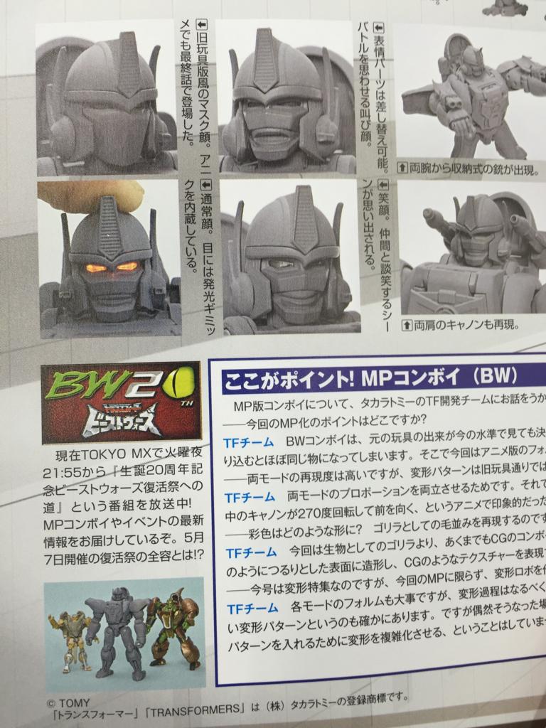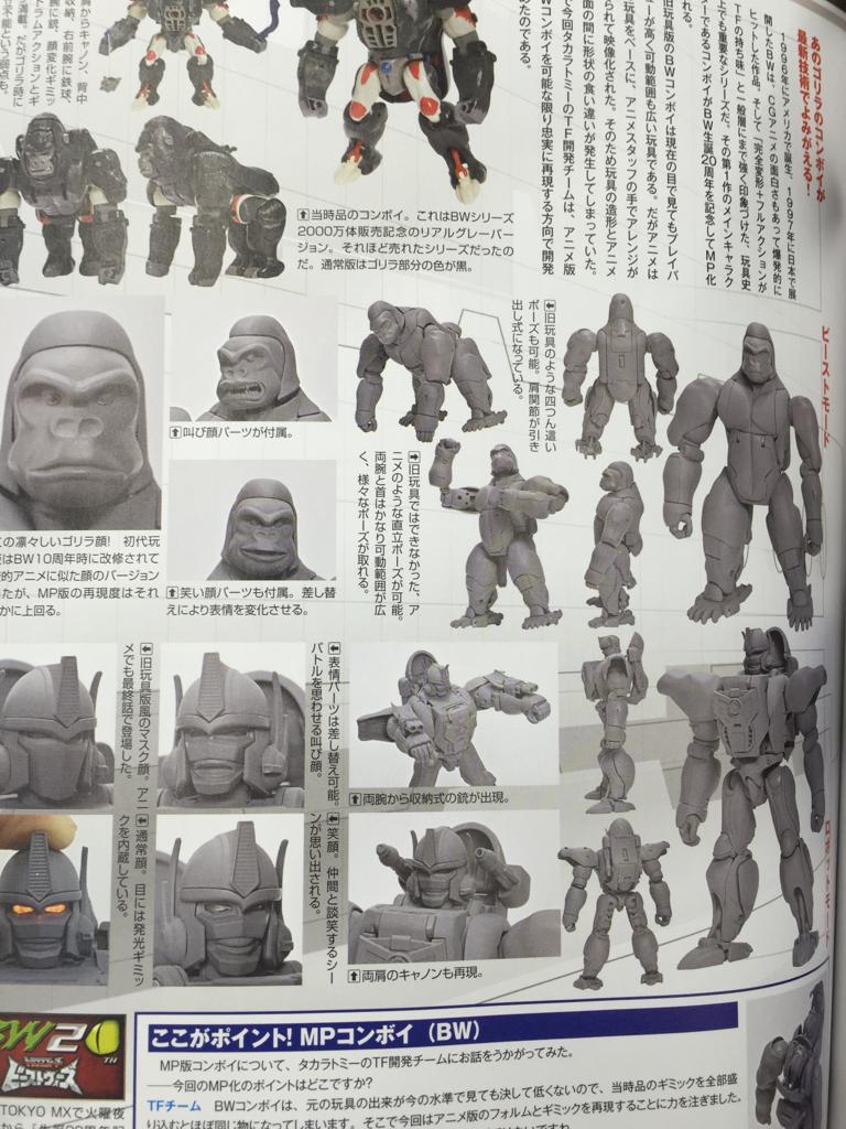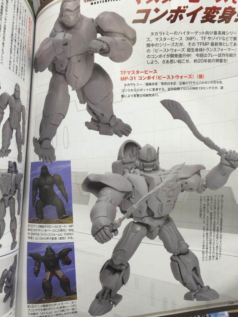 TFW2005 member Monrai has posted to that site a series of scans from Hyper Hobby Magazine showing off MP Optimus Primal! The Maximal leader's transformation is shown, specifically how the head works now that his robot mode chest piece is part of the gorilla gut. Also, we get our first look at his swappable faceplates, including various lipped expressions and a "battlemask" (AKA Toy Look) version. Keep reading to see!