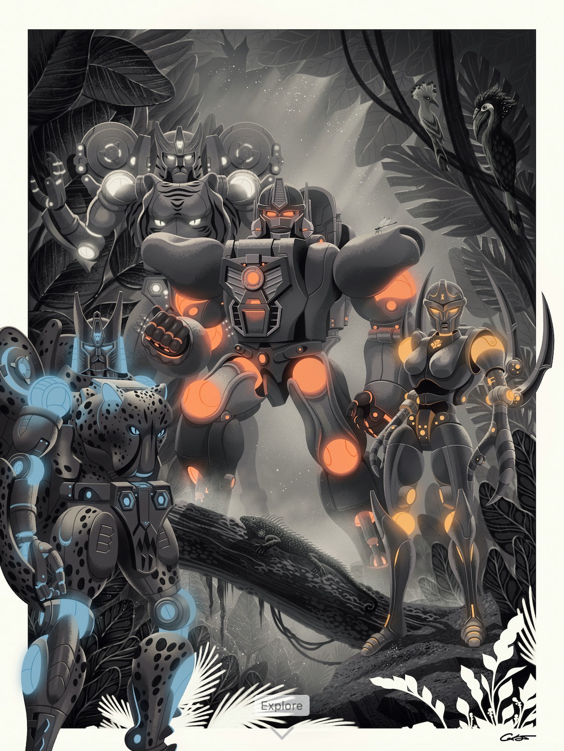 The next poster is said to be a Beast Wars homage to the Transformers: Rise of the Beasts film drawn by George Caltsoudas. These giclée prints will be available in two versions; a Dark edition of 50 prints and a Light edition of 25 prints that will be hand-numbered.