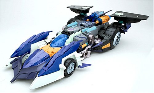 Well to just say it, this mode is basically likened towards a batmobile figure, apparently its supposed to be a prototype formula one racer. But this mode works out very well, it looks like a long bed mobile fortress if you think it suits him more as an emperor. But if not, well its a racer, the cons? Well there are a few, namely, the shin guards, they're not exactly folded anywhere, they're just left behind, with little nooks that are supposed to hold them in place from their edges, it just doesn't work. Way to destroy a perfectly good mobile mode. Your spoiler will probably end up having to be properly adjusted. Nothing perfectly fit.