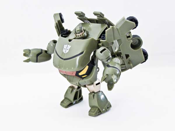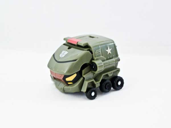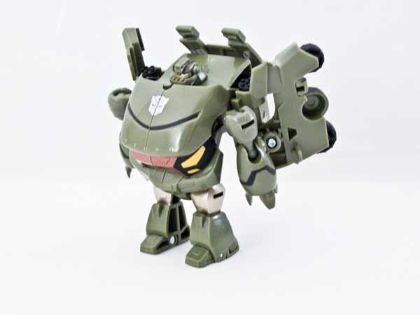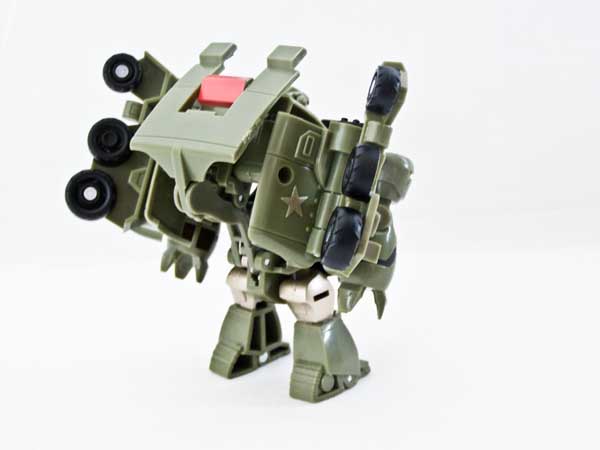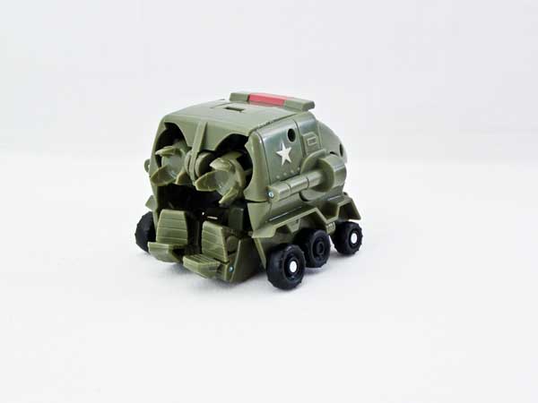 This figure is a snap to get into alt mode. Attach his arms to the tabs on the wheel assembly. Fold in his toes, then squeeze the wheels in and forward. That's all there is to it. Reversing the procedure is even easier. Just press on his lightbar to activate the gimmick, then fold his toes out.