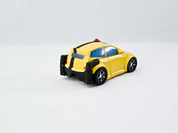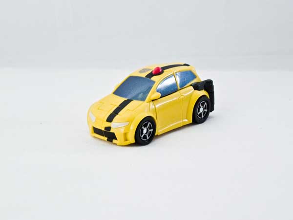 Bumblebee retains his compact sports car mode The colors are familiar, mostly being yellow with the black pinstripe. He also retains the red beacon on the roof.