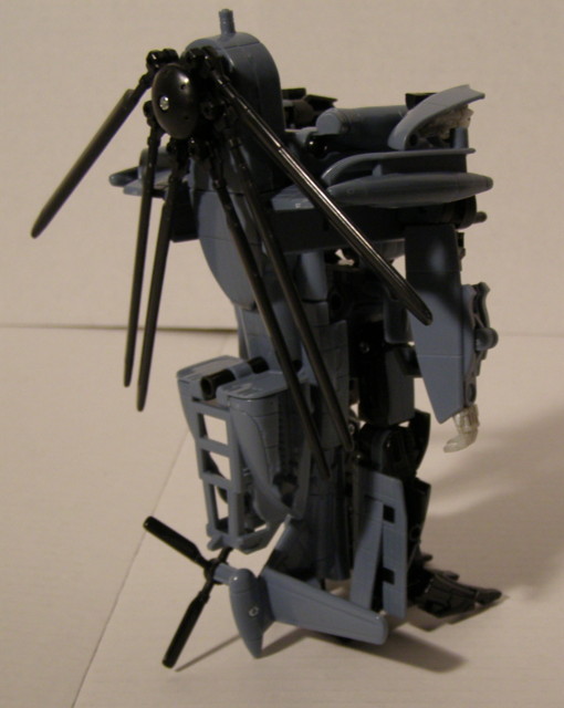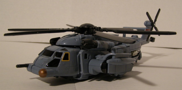 Blackout's alt mode is a Pave-Low helicopter. Transfomers has come a LONG way in respect to helicopter designs. Each one gets better, and Blackout is no exception to that rule. He is primarily a gunmetal blue. He has a bronze colored sensor on the left side of his nose and a laser cannon on the right side. There is a also a 4-blade rear rotor with balancing wing on his tail. The tail has some red striping behind the rotor. His main rotor assembly is a 6 blade design.