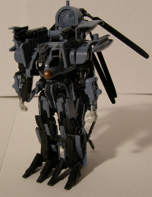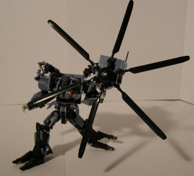 So what can you do with that disassembled tail assembly? Use it as a weapon, of course! By bending a pin hinge directly behind the main rotors forward 90 degrees and utilizing the pins on the tail, you can mount this as a weapon in either hand. So far, Blackout is by far my favorite 'Con of the group. Both modes are great and he's got great articulation. A definite add for your collection, even if the movie isn't warmed up to you yet.