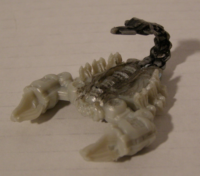 Scorponok in this instance is a small statuette. He is mostly white with some 'dirt' sprinkled on top. A waste of plastic, in my opinion. The gimmick is that you can open the cage and mini-Scorp will get the drop below. However, you can also mount the deluxe class Scorponok on the belly of Blackout via pegs. Toys R Us even has Voyager Blackout and Deluxe Scorponok co-packaged.