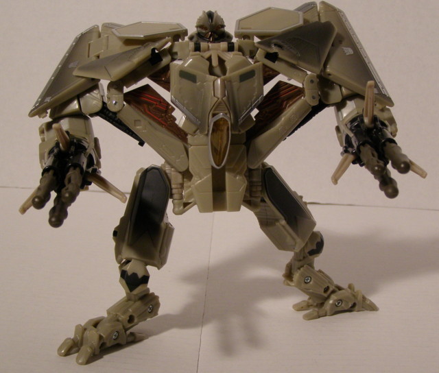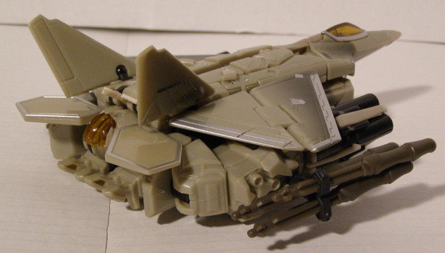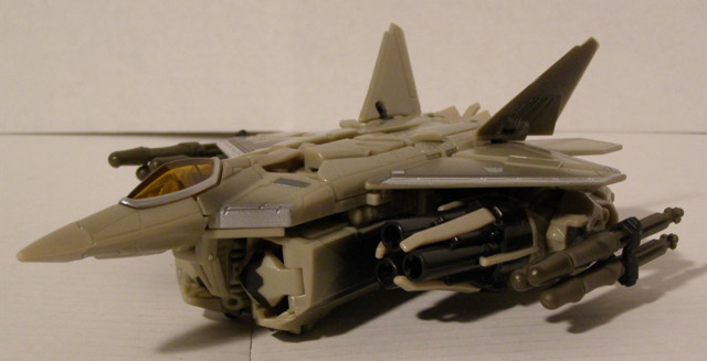 For being a modern streamlined jet, Starscream does seen excessively bulky. On the plus side, his cannons on either wing spin when rolling him on the ground. Those missiles also load into the cannons and launch with the touch of a VERY sensitive button. There is a buttton for each missile.