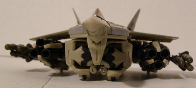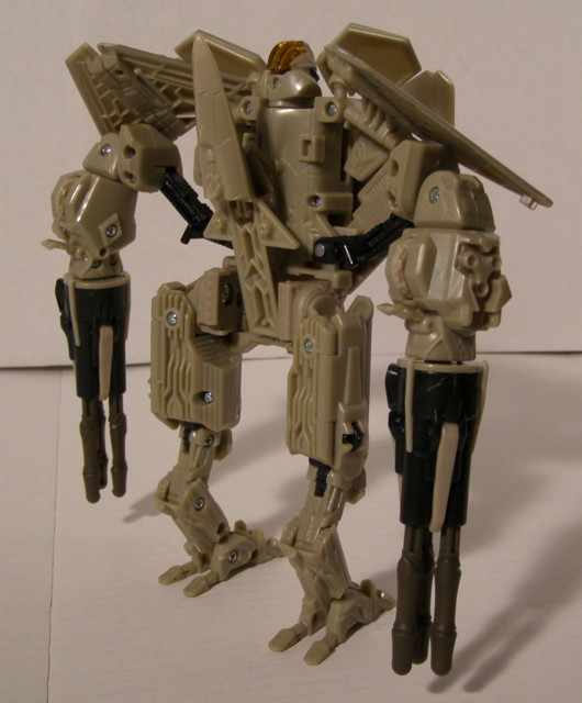Starscream is another example of an involved yet simple transform process. He also has a slick automorph feature. Lift the cockpit up a bit, make sure the arms are out, then fold the wings up. The cockpit will automatically pull back. One note of caution, however. This is a very fragile figure. The tailwings in particular are prone to popping off and it goes get annoying.