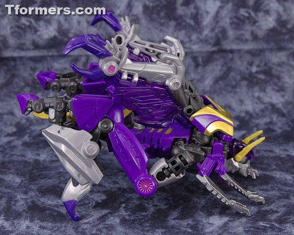 Whatever I may have felt about the robot mode, the insect form really irritates me. The central body does for the most part hold itself together, though the robot hands under the abdomen are really obvious no matter what you try to do. But the main sense dominating this is a feeling of instability. The rear legs are the largest portion of the body with freely moving parts in this mode, and they will move freely. The front leg pairs are mostly tabbed in place and are not actually articulated anyway. But Kickback's rear legs retain use of all their joints and absolutely do not lock in place anywhere. The robot hips have to bear the weight of the leg, and while they might manage fine for robot mode, the strength of the ball joints is a quality that falls sadly short in this mode. The robot pelvis halves are even supposed to kind of snap in place in the sides of the insect body for stability, but that barely works at all either. It should be made clear, Kickback has no useful poseability in this mode. There's only one position of the legs to let the toy properly stand, so there was nothing to gain by allowing the legs to retain any freedom of movement. It does nothing but hurt the toy. The wings can move a little at the base ball joints, but the midpoint hinge is rendered effectively useless by having the membrane pieces attached. The only thing that remains would be the antennae, which can raise and lower as you like with no immediately apparent detrimental effect anywhere else in this mode.