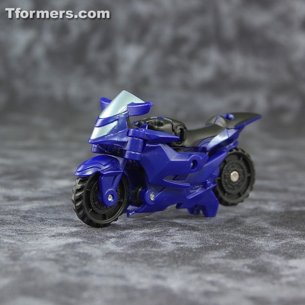It's a blue motorcycle, of course. A fairly good-looking one at that, with no obvious robot pieces hanging off of it. If I'm not mistaken she might be in scale with the Basic Human Alliance drivers, but at the moment I can't test this. What she's definitely out of scale with are the other Legion Autobots, since she's just as long as a motorcycle as they are as cars and ambulances. Compared to the RID Deluxe it has different color problems that explain why the blue was lightened on that figure: the blue is so dark as to blend with the black and make nearly the entire bike look monochrome. On the upside, the windshield and headlights have been painted silver, so they don't vanish into the bike as badly here! It also doesn't roll as well as the bigger figure, but I suspect that's because it was designed to sit up on its own, with a kickstand being unfeasible at this size. Again, since that makes my life as a photographer a bit easier, I appreciate this.
