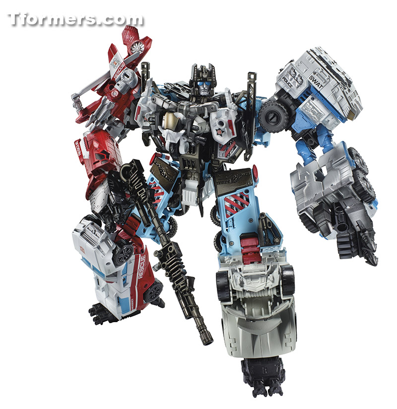 Though a bit of a late arrival to the press kit party, we now have the official pictures of Generations Defensor, featuring the combination of all six Protectobots. While there has been some issue taken with the appearance, it seems like the torso mode design for Hot Spot has learned from the Optimus mold, adding space between the core body and the thighs to create better proportions and body definition overall, with the second picture showing this arrangement is still fully mobile. Click through and check them both out!
