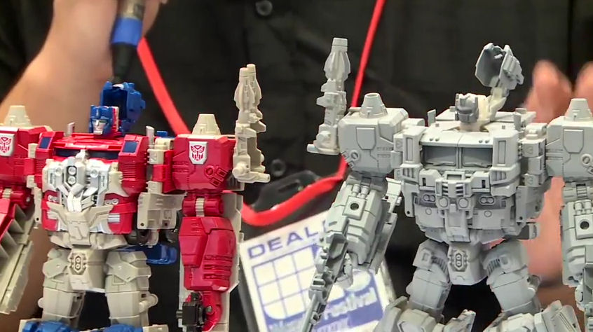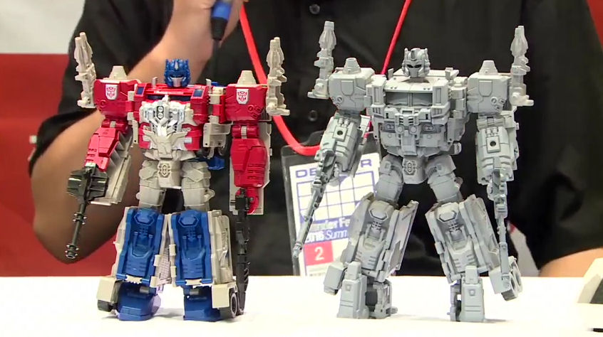 Autobase Aichi has posted screengrabs from a six hour! YouTube video of Wonderfes footage captured by Dengeki Hobby Web! The part probably of most interest to us is captured in those screens: a side-by-side comparison of Legends Series LG35 Super Ginrai with Titans Return Leader Class Powermaster Optimus Prime! In addition to the other changes, we see that the Headmaster robot - presumably named Ginrai - has a more traditional Optimus Prime face than PMOP's Orion Pax look. Keep reading and clear your calendar for the screens along with the video!